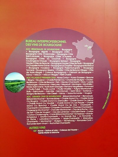 Chablis(シャブリ)やGevrey-Chambertin(ジュブレ・シャンベルタン)などブルゴーニュの全てのAOCとIGPが書かれています。